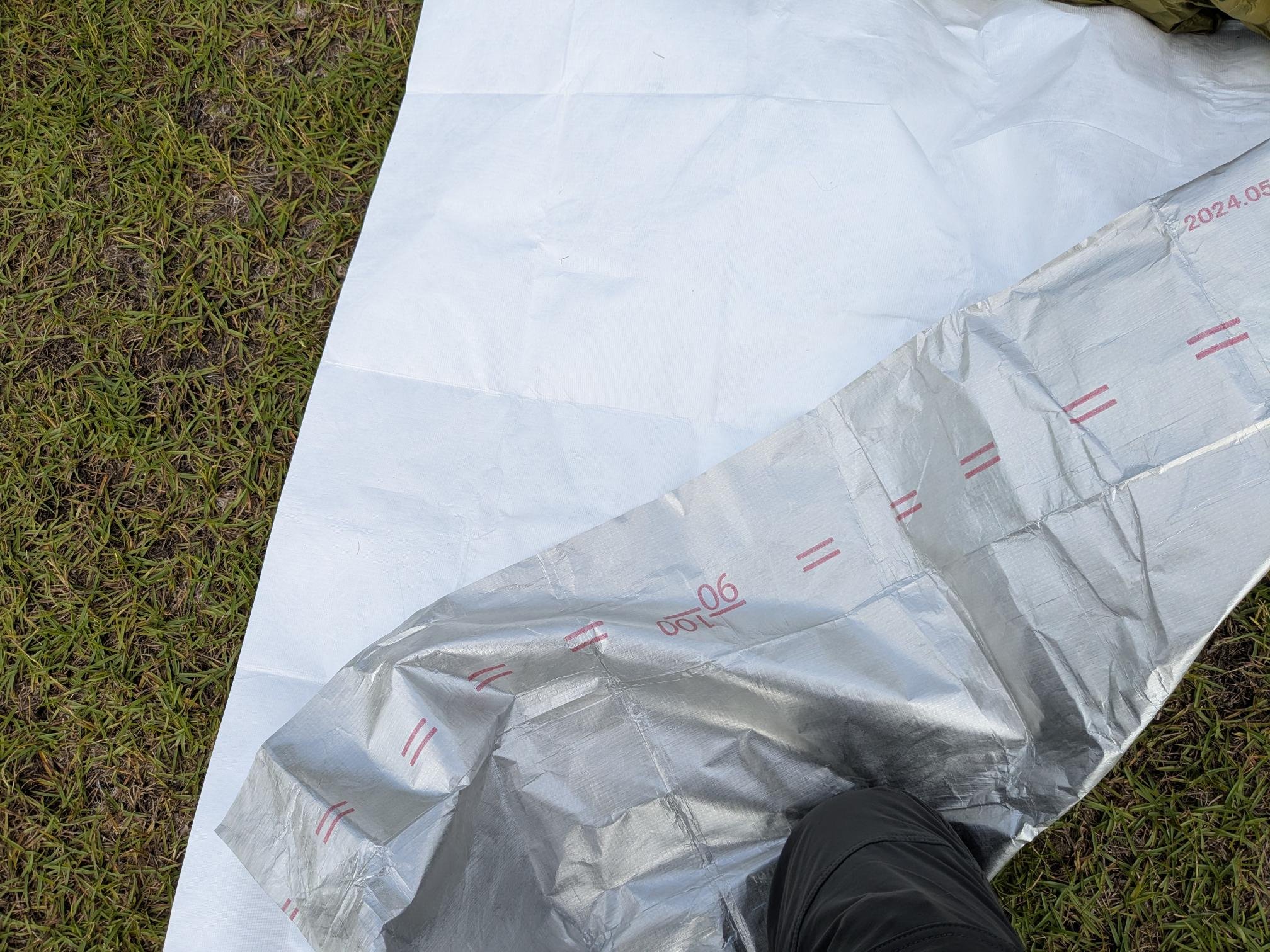 まずはテントの下に敷くシートです。主な役目は防水ですが冬季は冷えの遮断も兼ねます。皆様はよくナイロンシート、しかも隅にハトメなど施して補強したものをお使いですが、グラム教信者には重すぎます。原理主義者はこれです。タイベックシート 120g。